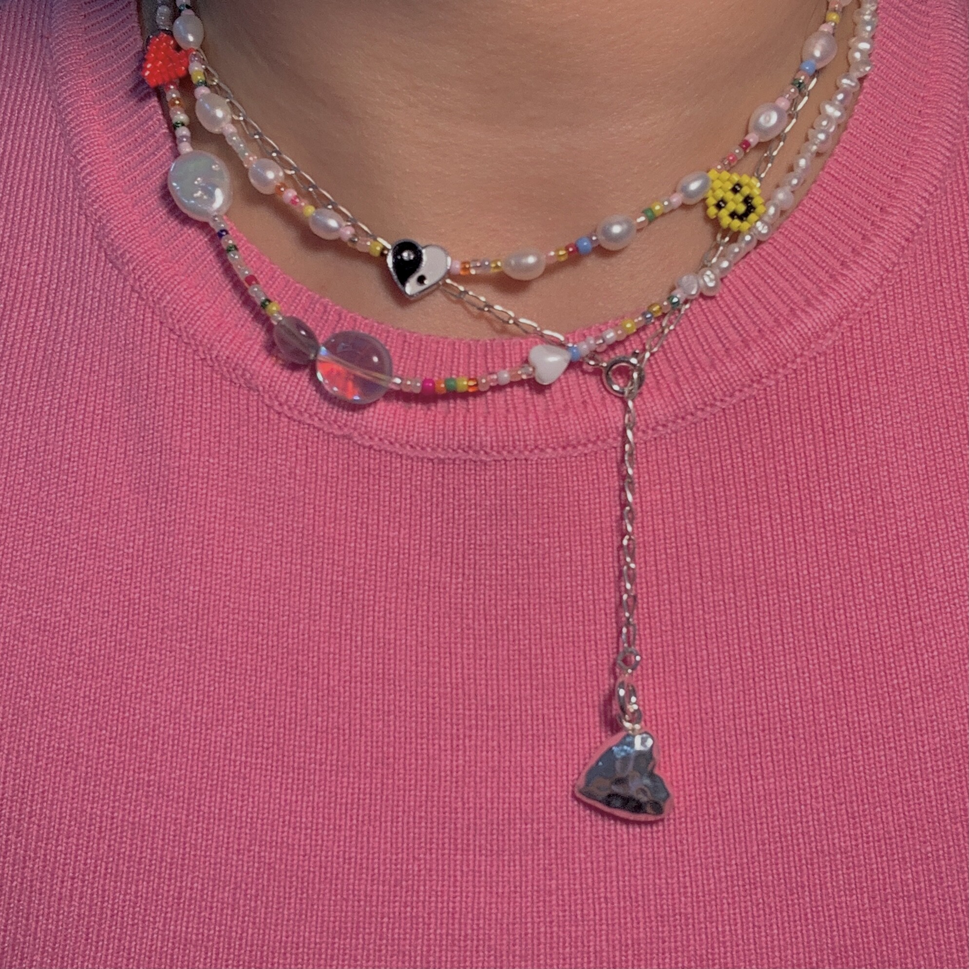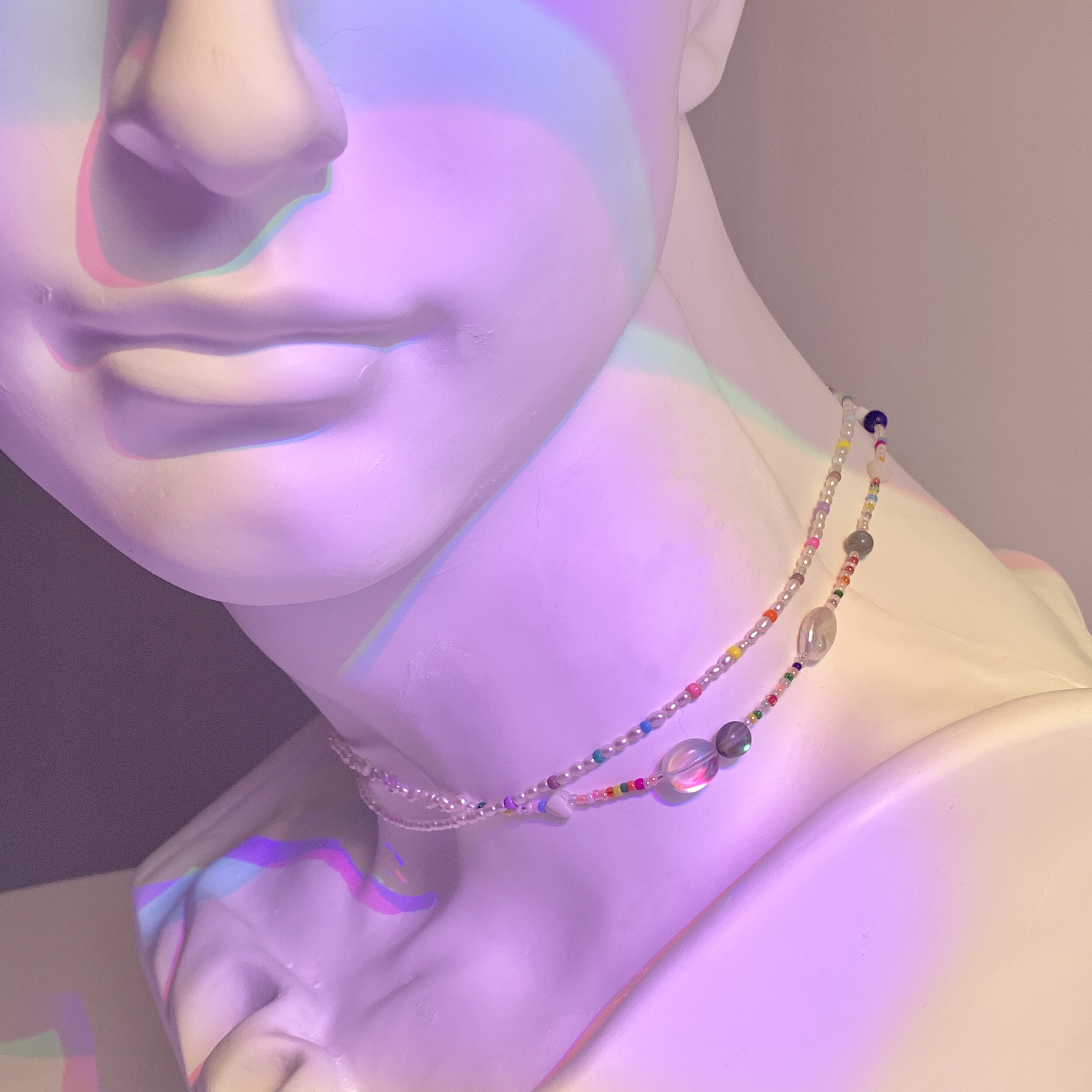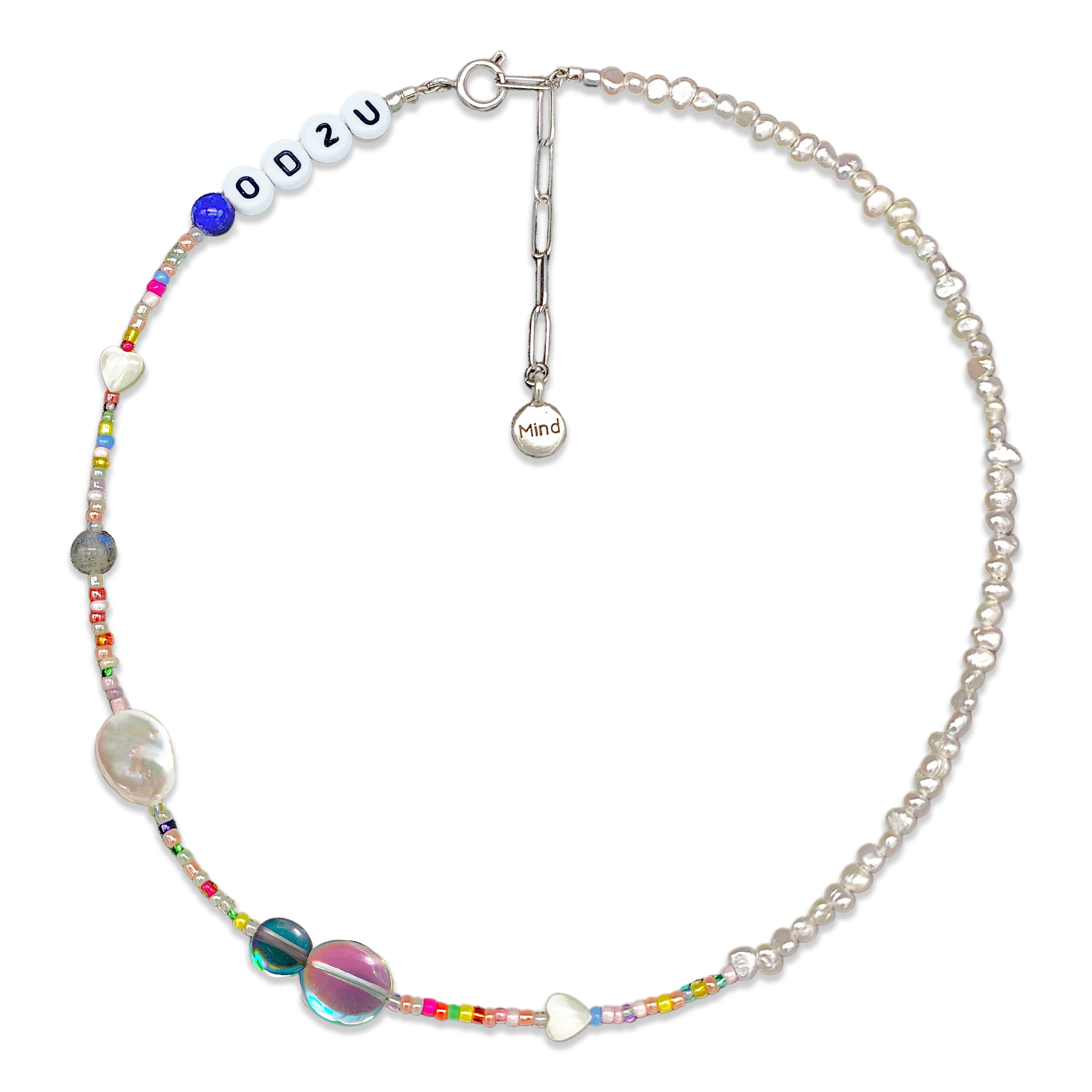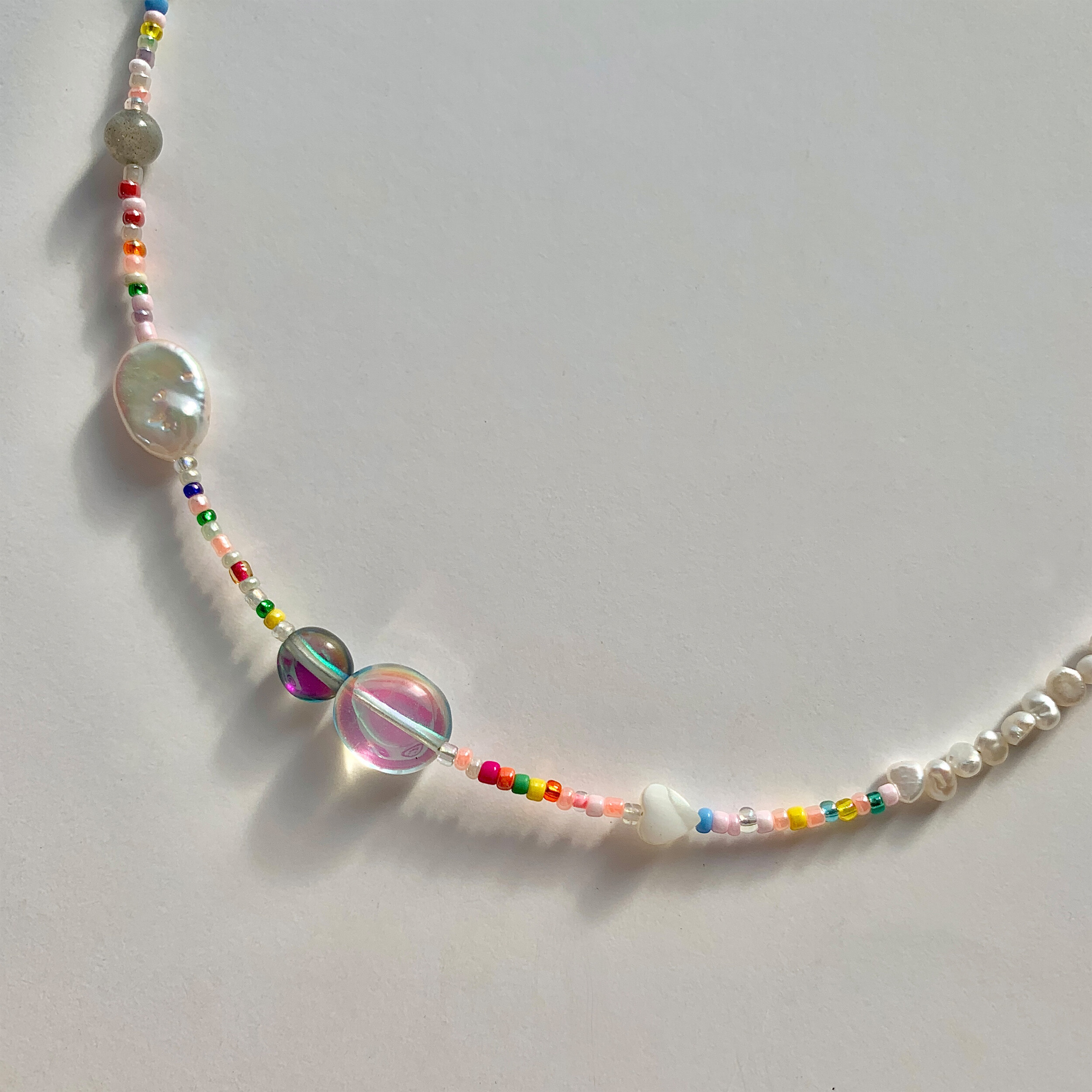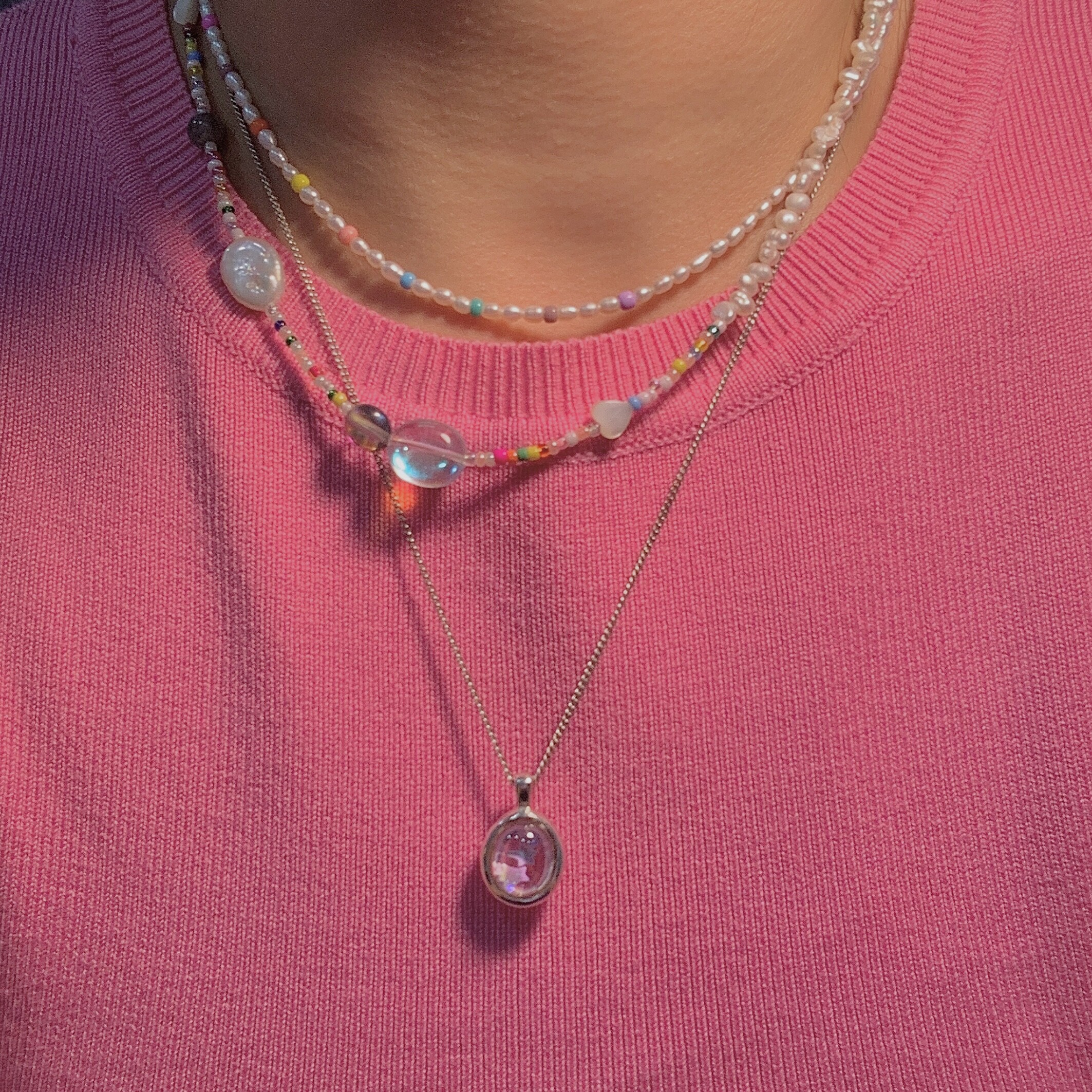 빛에 따라 여러 색감을 띠는 홀로그램 레인보우 글라스가 포인트가 되는 핸드메이드 담수진주 & 비즈 목걸이. 비즈의 색 조합은 제품에 따라 조금씩 달라질 수 있습니다.