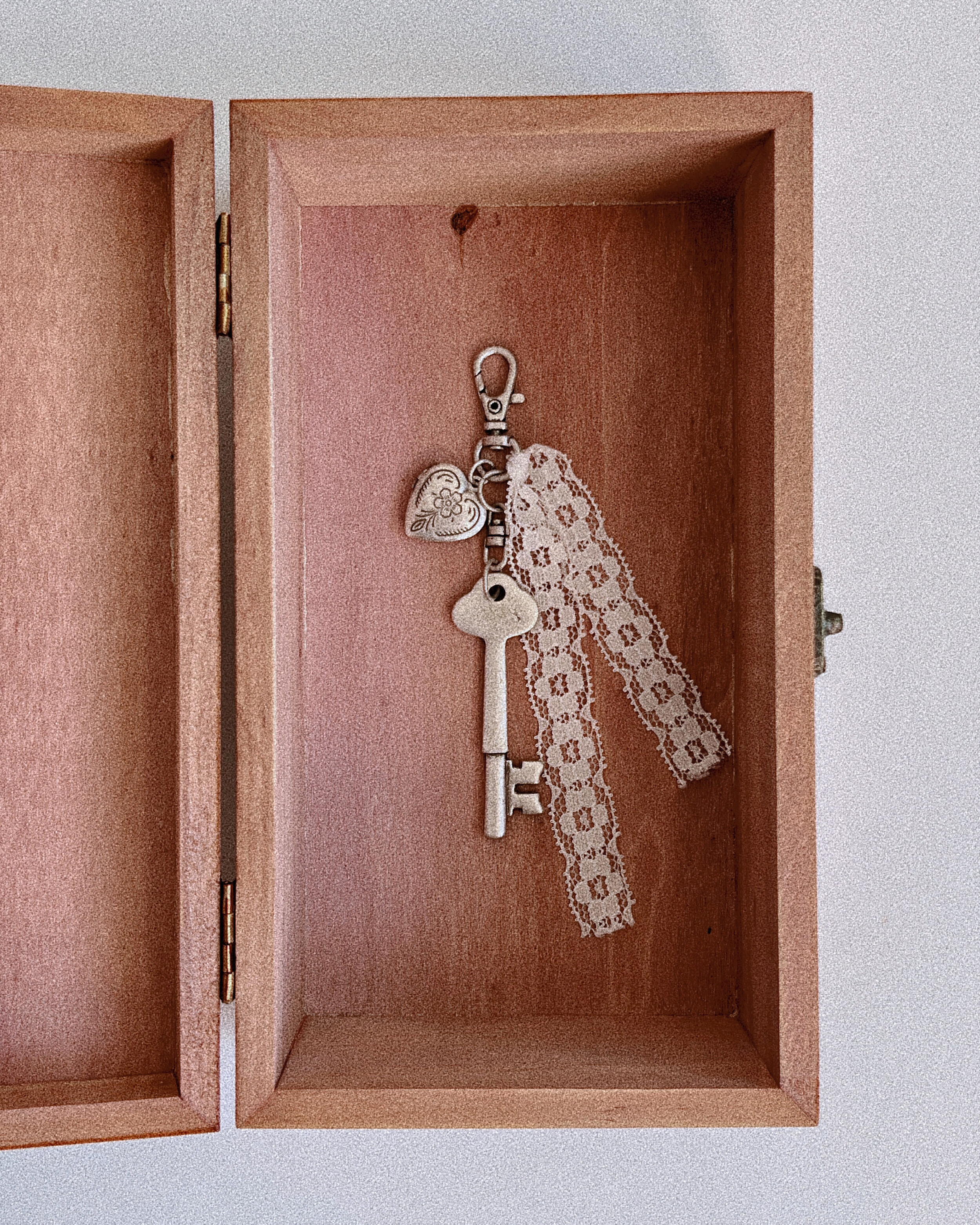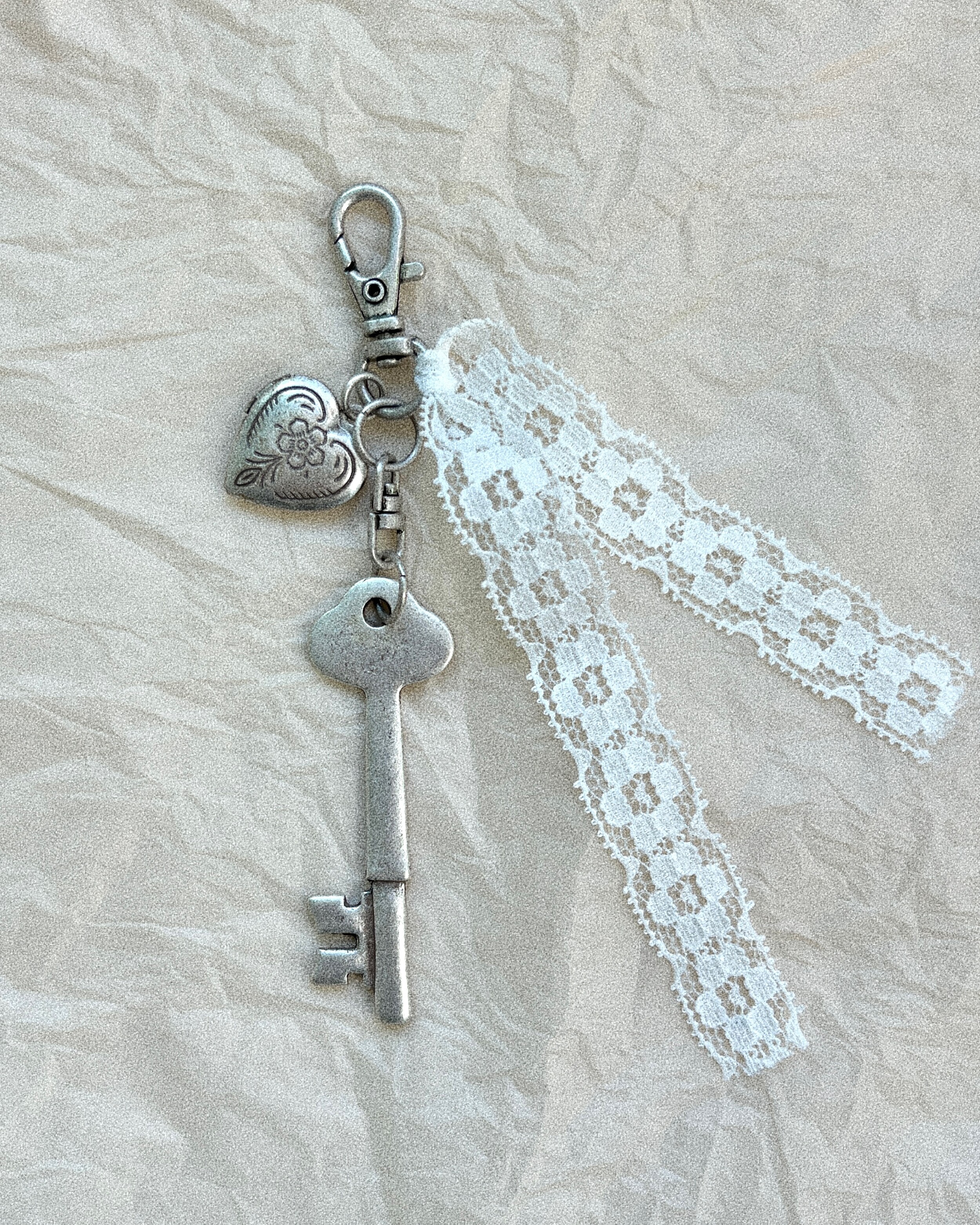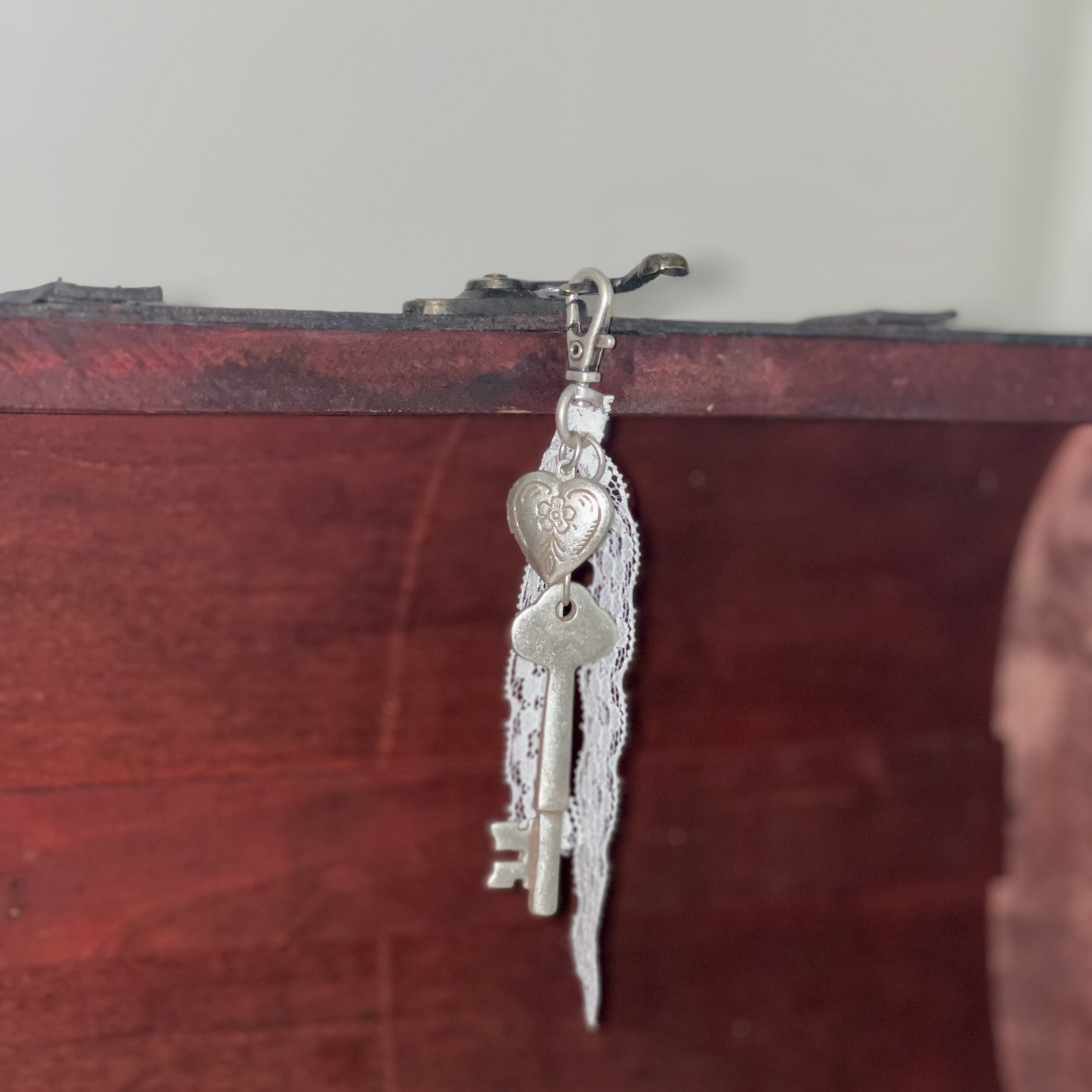🗝️ An antique key pendant, a heart rocket pendant that opens on both sides, and lace decorations.